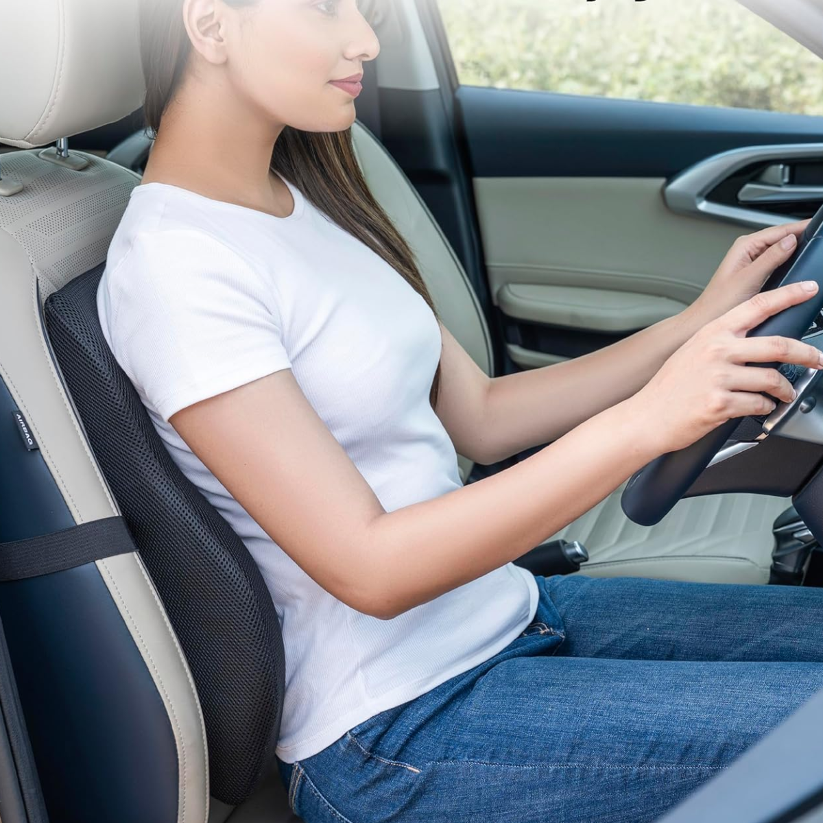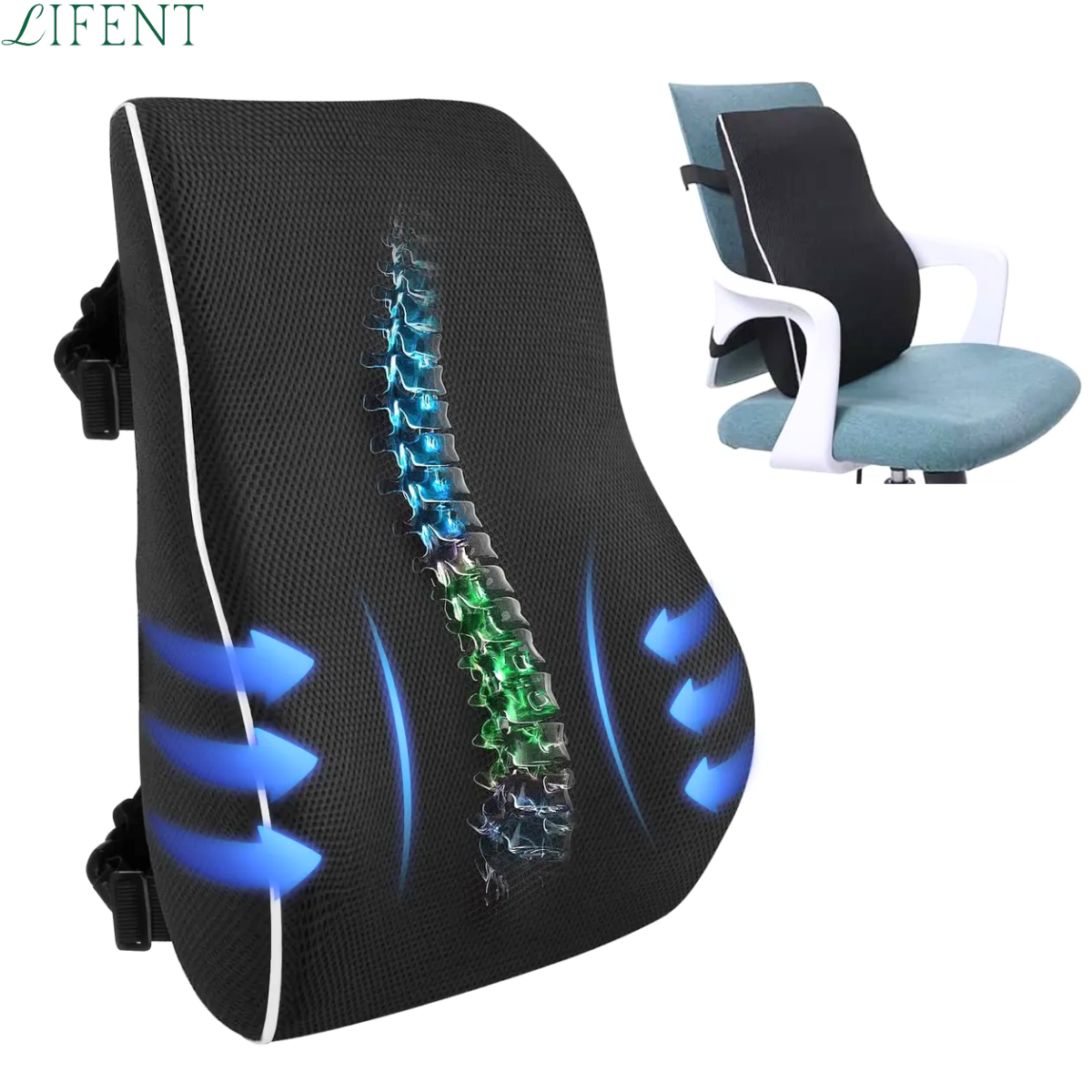 Suporte lombar ajustável, design ergonômico e total conforto para usar em casa, no escritório ou no carro.